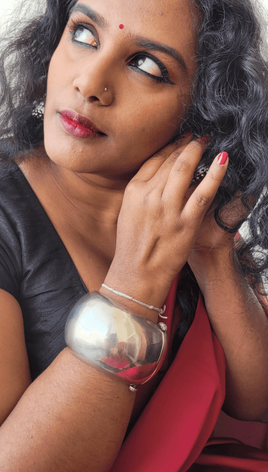 From the antique soul of vintage silver kadas to the clean lines of 92.5 silver bangles, each piece in this collection is a celebration of movement and tradition. Detailed textures, embossed patterns, and time-worn finishes reflect India’s jewelry heritage, while refined silhouettes bring them effortlessly into the now.