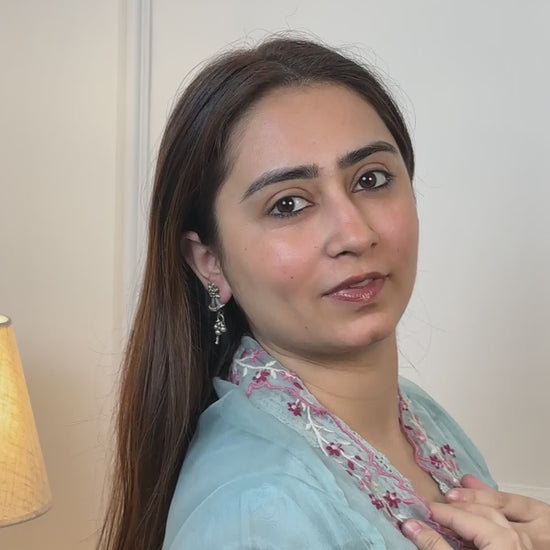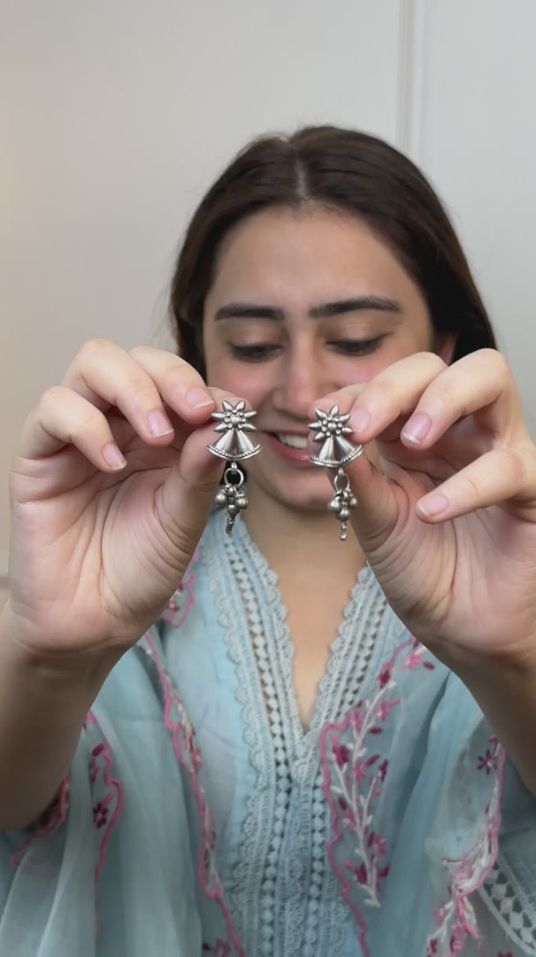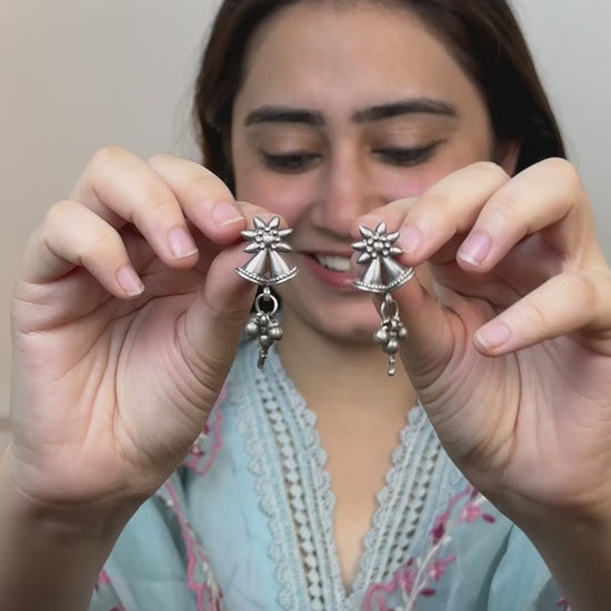 Delicate yet striking, these 92.5 silver floral studs flow into beautifully crafted conical motifs, ending in a soft cluster of ghungroos that add gentle movement. A unique blend of traditional charm and minimalist elegance, they’re featherlight and perfect for everyday wear with a hint of occasion-ready grace.