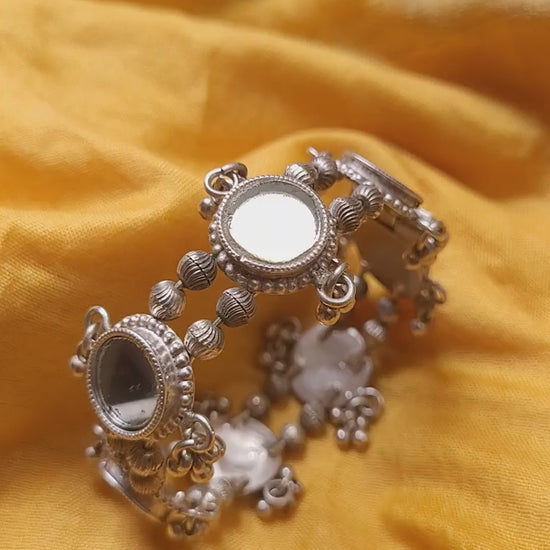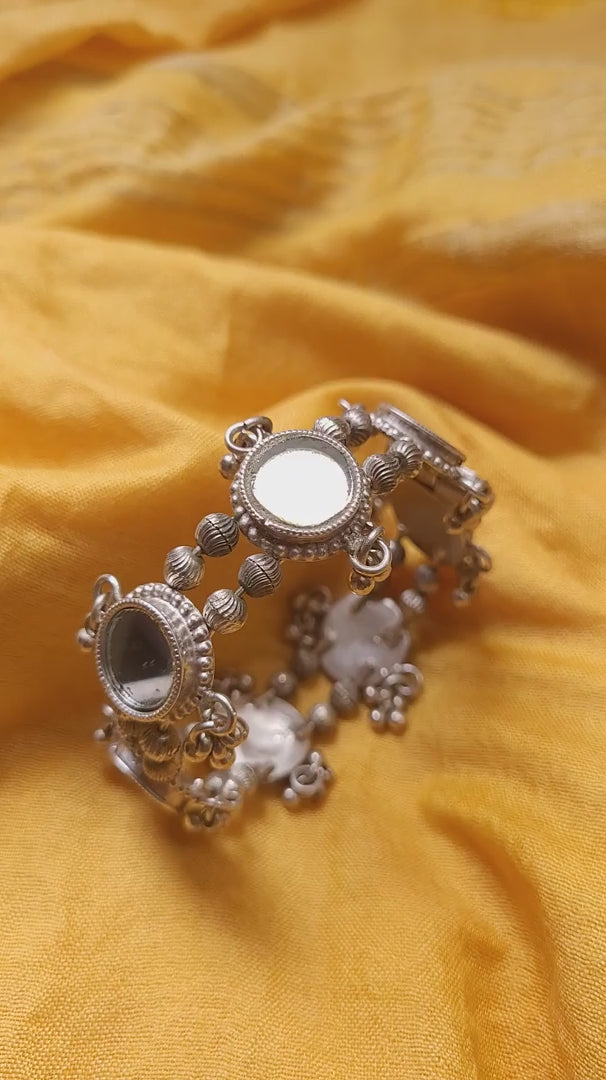 Crafted in 92.5 pure silver, this elegant kada features hand-cut circular glass set within textured silver frames, each one a glinting little window of light. Dainty silver ghungroos add playful movement and a soft jingle to your every gesture ๐Ÿ’ƒ. The openable design ensures it slips on with ease while staying securely in place. Lightweight yet striking, itโ€™s a festive must-have, equally at home with embroidered kurtas, silk saris, or layered bangle stacks. Whether you're dressing for a sangeet or just want to add a little drama to your day, this kada brings both sparkle and soul.