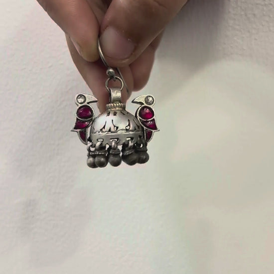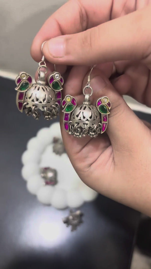 Elevate your ensemble with Pancchi, our vintage Rajasthani jhumkas that capture the soul of tradition with a playful, modern twist. Featuring delicate cutwork vintage silver jhumkas, charming ghungroos, and vibrant simulated kundan stones set on a base of pure 92.5 silver, Pancchi is perfect for long celebrations or adding a pop of color to your everyday look.