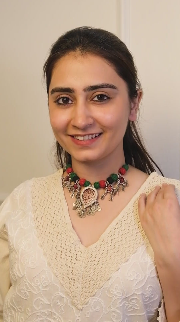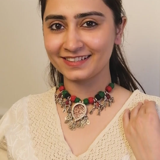 A necklace that feels like it has travelled across centuries, at the heart of this vintage piece lies a grand paan-shaped pendant—its surface engraved with Persian script on a deep red stone, a reminder of poetry etched into memory. Around it bloom smaller pendants, each carrying the moon 🌙 and star ⭐ carved on glowing red glass, framed by ghungroos that tinkle softly and delicate leaf-shaped danglers. A riot of colours and textures, this multicoloured beauty is a joyous celebration of festivity, heritage, and craftsmanship.