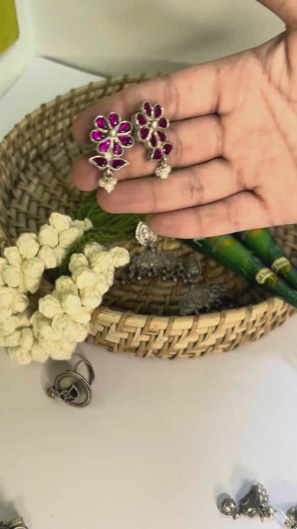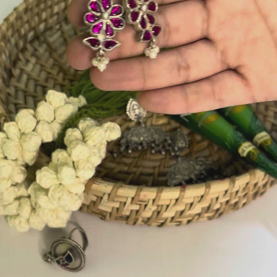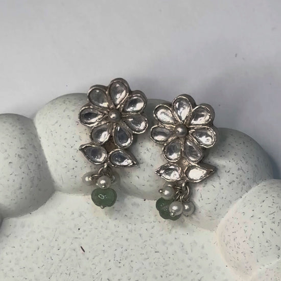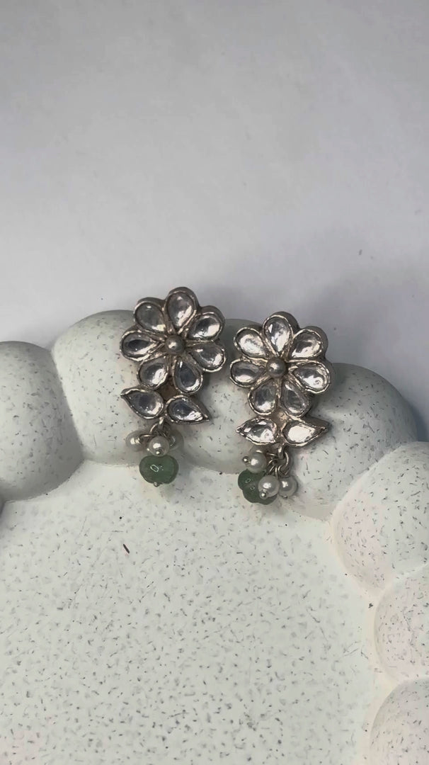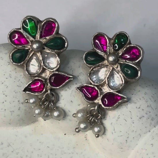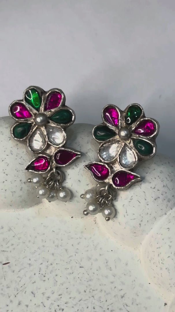 Beautifully handcrafted and effortlessly celebratory, these 92.5 silver floral studs are embedded with coloured kundan stones, giving them a rich, luminous finish. Each pair is delicately edged with pearls, adding a soft, traditional glow that makes them perfect for weddings, festivals, and all things special. Despite their ornate look, they are wonderfully lightweight, making them ideal for long events. Available in three gorgeous colours — pink, white, and multicoloured.